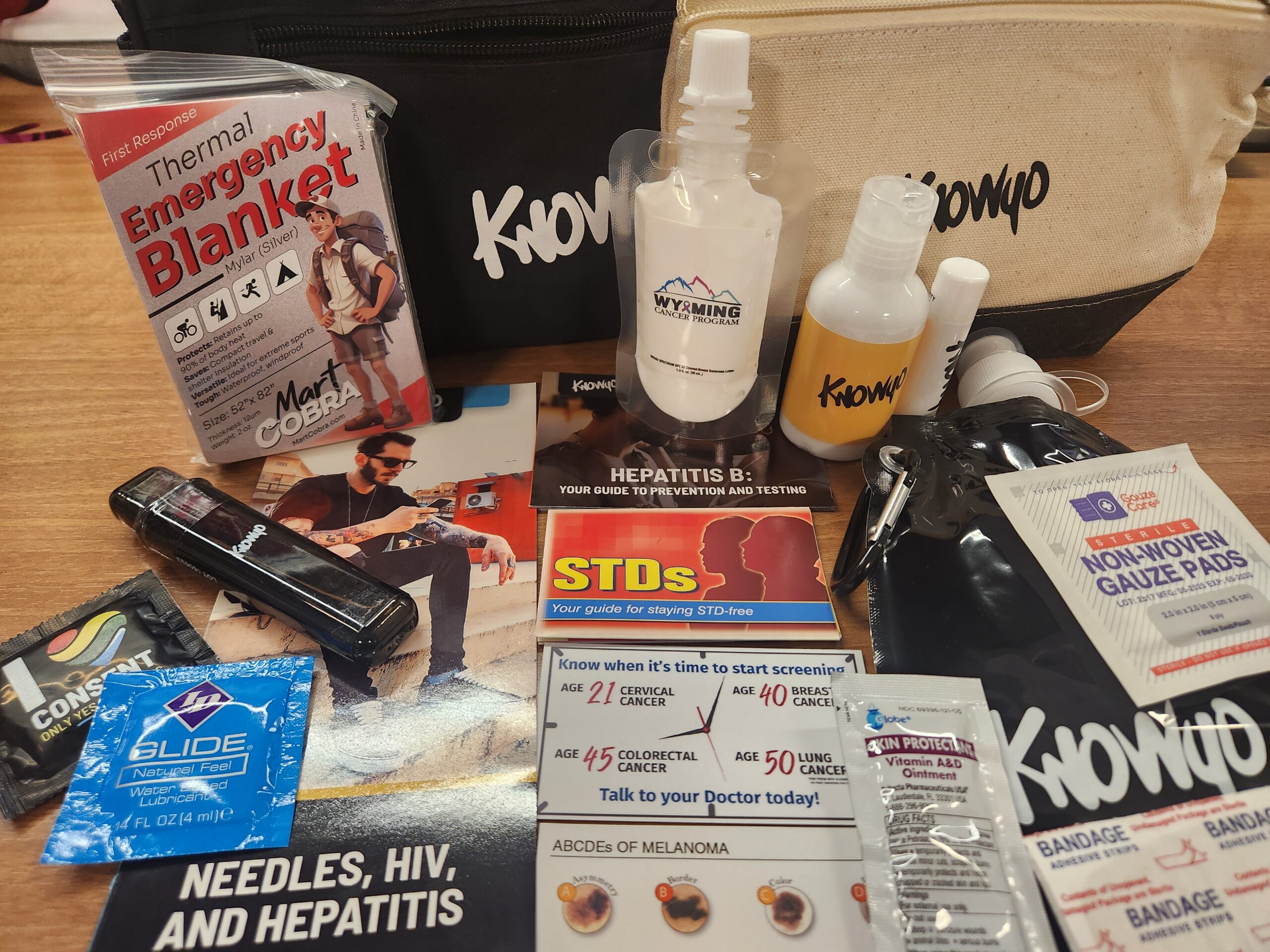 The kits include a toiletry bag, cosmetic bag, collapsible bottle water, foldable toothbrush, lotion, lip balm, foldable mirror/hair brush, triple antibiotic ointment, gauze, bandages, emergency blanket, condoms, and educational program material.